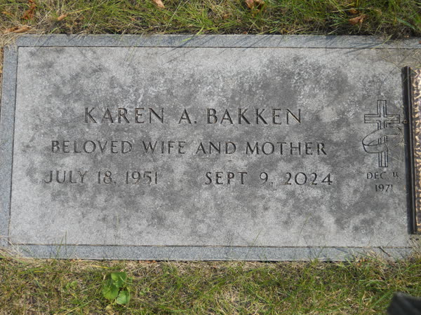 Karen was preceded in death by her spouse, Jerry Bakken; her father, Daniel Gill; her stepfather, Robert Smith; brother, James Gill; and her in-laws, Aldon and Arlene Bakken.