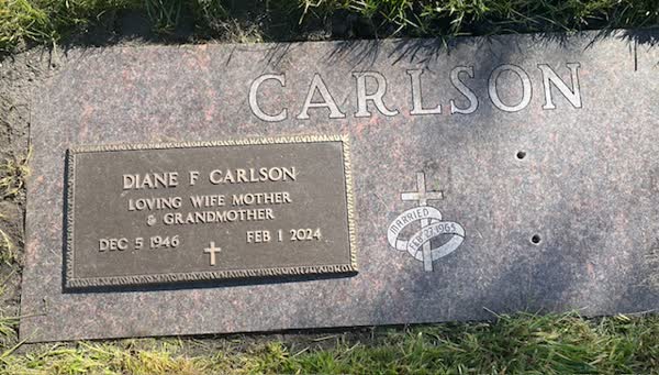 Diane will be sorely missed by surviving family members: husband, Herb Carlson; son, Allen Carlson; and daughter Angie (Scott) Rortvedt; grandchildren: David (Katarina) Carlson, Brianna (Kyle) Swanson, and Carley Rortvedt (fiancée Bennett Rindy); great-grandchildren: Tristen Carlson, Ava Carlson, Charles Carlson, and Eliza Swanson; brother, Rick (Barb) Hinrichs; several aunts and cousins as well as nieces and nephews.