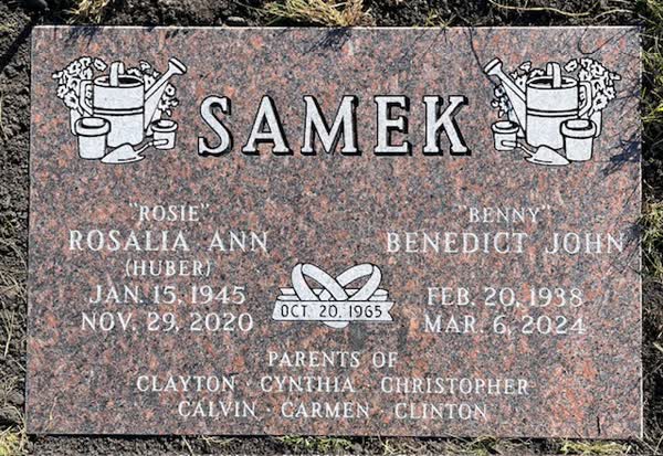 Rosalia Ann Huber was born January 15, 1945, in Valley City, ND, the oldest of five children born to Alois and Isabel (Gassmann) Huber. Rosie grew up on the family farm near Fingal, ND, and graduated from Fingal High School in 1963, where she received the Good Citizen Award. She met her future husband, Benedict Samek, through a priest, Fr. Heally, at Holy Trinity Catholic Church in Fingal during a fall supper, where she was a waitress at the Samek family table. Rosie and Benny were married there by Fr. Heally on October 20, 1965. They made their home near Wimbledon, ND, where Benny farmed, and the couple started their family. They lived in Breckenridge, MN, for a time and moved to the family farm in rural Wahpeton in 1975, where they completed their family. The family became members of St. John’s Catholic Church.